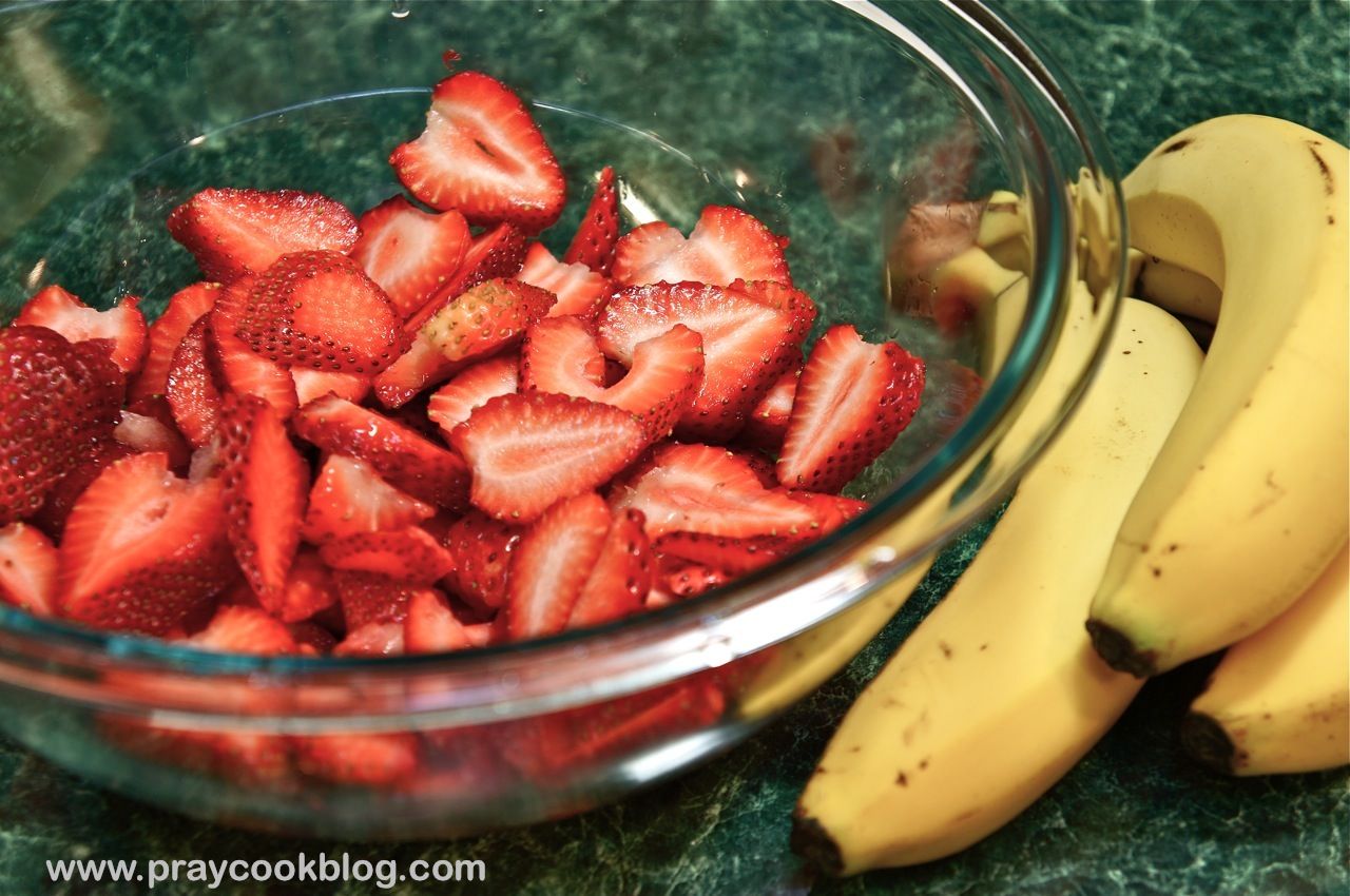 - Wash strawberries and slice. Cut bananas and coat in lemon juice.