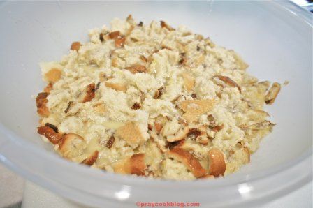 - Mix together granulated sugar, eggs, and milk in a bowl. Add vanilla. Pour over the cubed bread and let sit for 10 minutes.