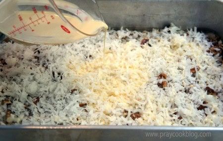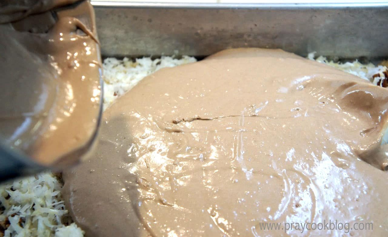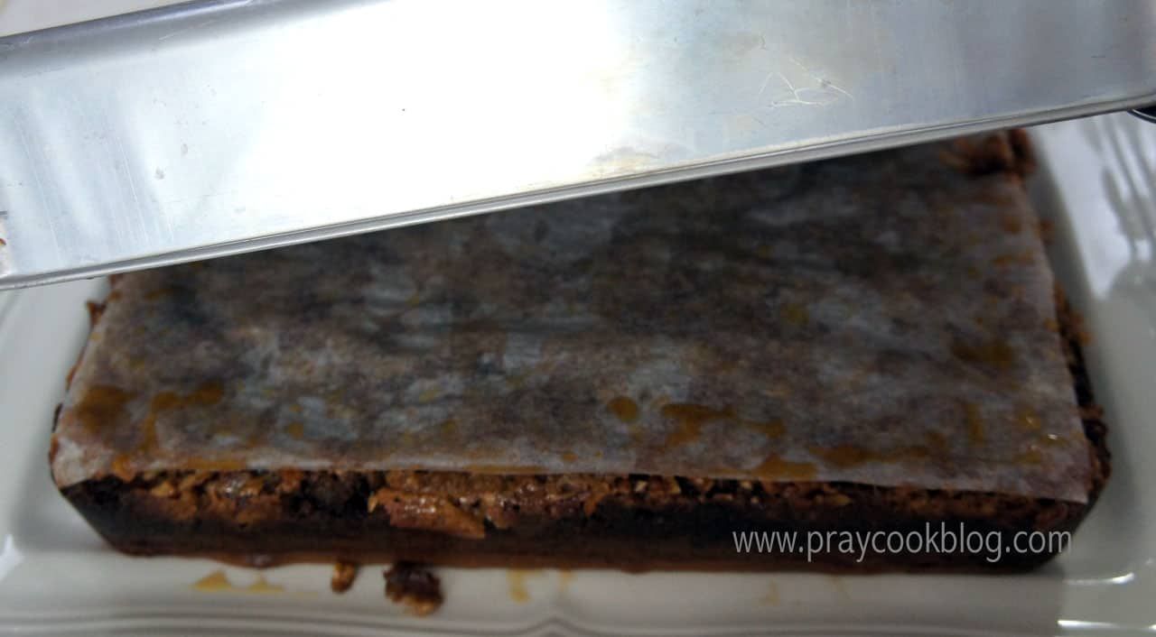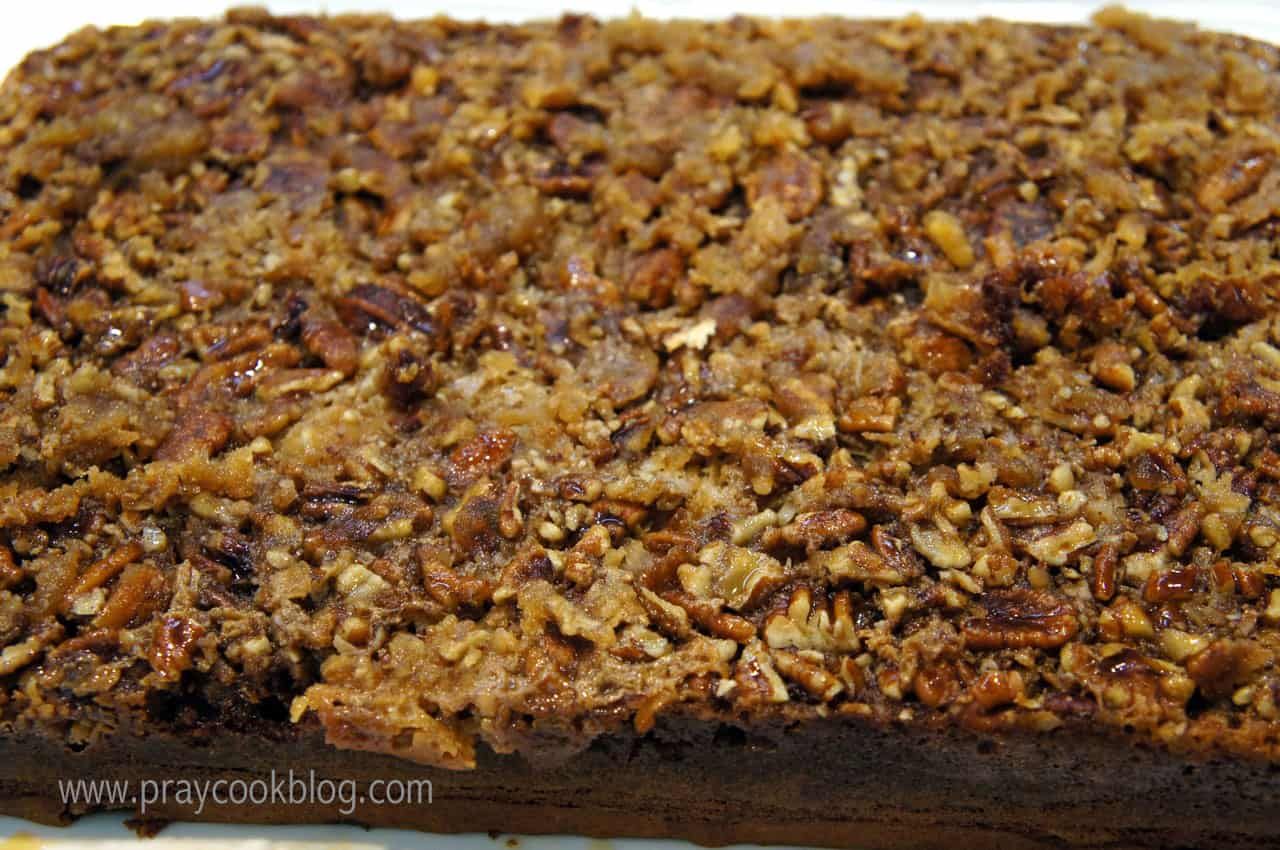 I really try not to get too excited about knock ’em dead recipes like this one, just in case you don’t think like I do. But then, who doesn’t think a super easy cake, loaded with chocolate and topped with a crunchy, gooey, coconut-pecan frosting isn’t something to get excited about? Especially at this time of the year when you are already putting in 36 hour days and still need to make something that will knock ’em dead at the company Christmas potluck? I first heard about this upside-down cake recipe from my friend Leslie in Nebraska. She was making it for a Halloween potluck at work. She was so excited about making it that I got excited about tasting it! She said “it’s the best and everyone LOVES it”. My Chief Culinary Consultant’s favorite cake is German Chocolate. I was curious what he would think of this cake. I started by greasing the sides and bottom of 9″ x 13″ baking pan with shortening. Then I cut a piece of parchment paper and laid it in the bottom of the pan. The topping is the first to go in the pan after melting brown sugar and butter. Pecans and coconut are sprinkled over the sugar/butter mixture and then evaporated milk is poured over it all. The Chief isn’t particularly fond of box cake mixes, so I kept that little nugget of information to myself. However, you should know, this cake is deliciously easy – starting with a Duncan Hines German Chocolate cake mix! The cake is mixed up according to package directions and spread over the coconut/pecan layer. Into the oven this cake goes baking for about 40 to 45 minutes or until a tester comes out clean. The cake is carefully inverted onto a serving plate and the parchment paper removed. Look at this amazing cake! It tastes as good as it looks. Ooey-gooey, crunchy, pecan coconut over German chocolate cake. Thank you Leslie for sharing this recipe with me. You are right – “everyone does LOVES it!” ~ including my chief taste tester and my sous-chef dish-washing mom and me!