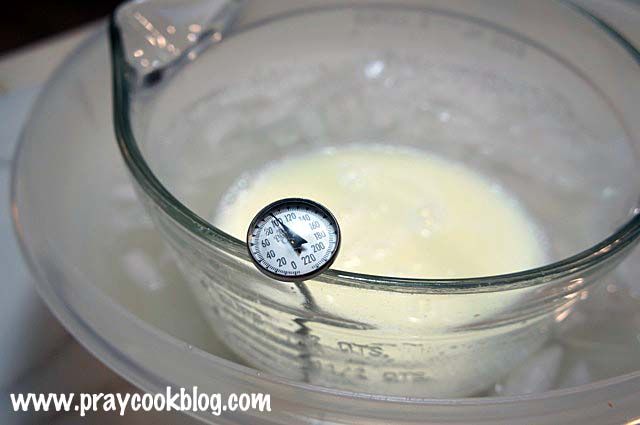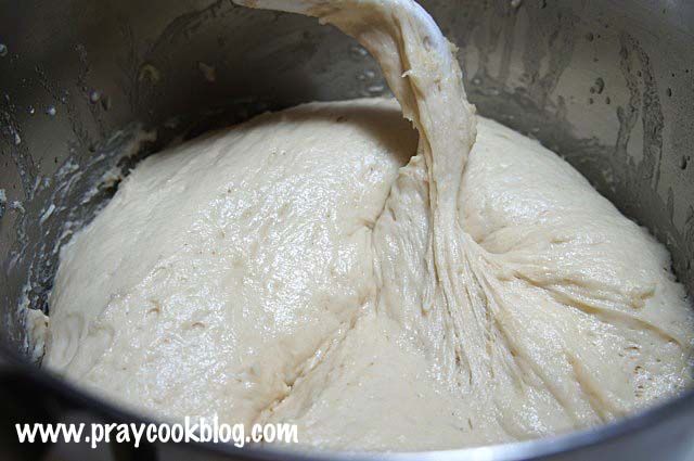 Cool the mixture to 105 to 110 degrees. If you don’t have extra ice, just set milk out to cool. When the milk has cooled, remove from ice and sprinkle yeast over the milk mixture. Stir only to mix. Allow to stand for 5 to 10 minutes. Stir in 4 cups of flour and cover. This can be done with a mixer or with a spoon by hand. Dough is very soft, more like a batter at this point. Allow to stand for 1 hour.