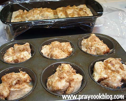 Grease a 9″x5″ loaf pan and a small muffin tin. Set aside. When you are ready to use the dough, turn it onto a lightly floured surface. Roll the dough out with into a rectangle about 18″ wide and 9″ tall. Spread with 4 to 6 tablespoons softened butter. Sprinkle with 1/2 cup sugar and and even sprinkling of cinnamon. More or less according to your taste.