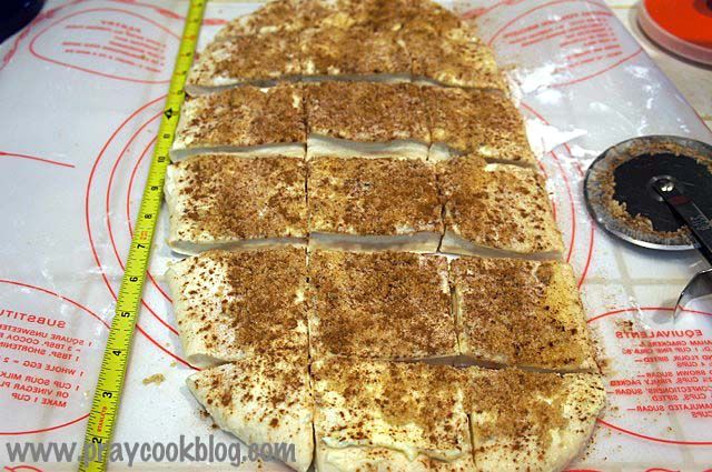 In the morning it only took 1-½ hours from refrigerator to table. The beautiful dough is rolled out into a rectangle about 18” inches wide and 9” tall. It is spread with butter and cinnamon and sugar. Using a pizza wheel, or a very sharp knife, the dough is cut into six 3” strips and those strips are each cut into 3 pieces, leaving 18 3” squares. Even using a ruler you can see that I ended up with a few little squares. Not to worry though I had the perfect use for those!