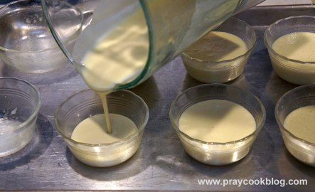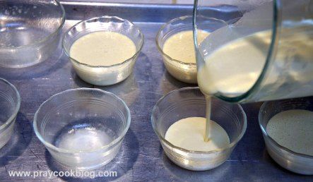 The directions say to prepare nine 3/4 cup custard cups or ten 1/2 cup muffin tins. I divided the batter between 8 custard cups. I started out with 1/3 cup batter (measured) and quickly dispensed with the measuring cup and just poured it in each cup.
