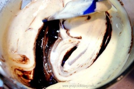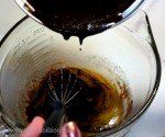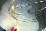 While the chocolate is melting I stirred together the remaining sugar and 4 eggs. Half of this mixture is then whisked into the chocolate/butter mixture. Constant stirring keeps the eggs for actually cooking from the heat of the chocolate. The remaining half of the egg/sugar mixture is whipped on high-speed until it is fluffy and doubled in volume.