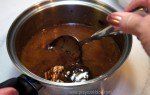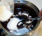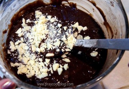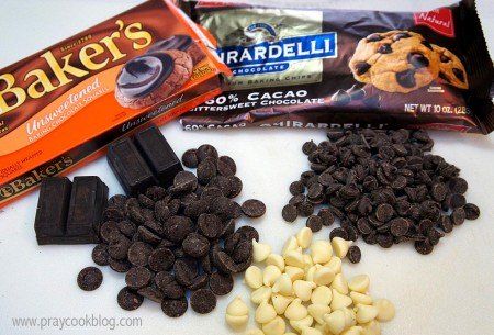 The chocolate (except the white chocolate) is carefully melted along with unsalted butter. I turned the burner on low, stirred as it melted and it did fine. A cup of sugar is then stirred into the melted butter/chocolate mixture. Vanilla is added after the chocolate has melted and is removed from the stove.