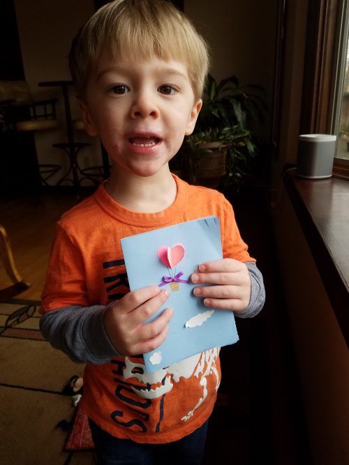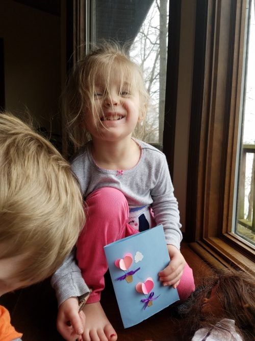 I really had fun making these. After we helped our little student with hers, Tim and I both made one. Then, our friend, Mary came in and made one! I don’t always take the time to make handmade things, but doing crafts is a great way to bond with people. Plus, who doesn’t love getting a handmade card? I give this one 5 stars because it would be a great thing to do with kids of all ages, and it always turns out looking great!