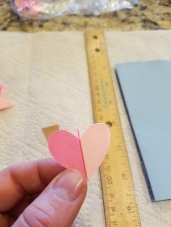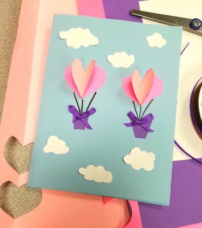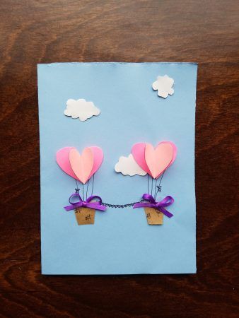 Use the blue construction paper for the card so it looks like the hot air balloons are in the sky. To make the balloons, put glue on half of two hearts. I didn’t have a glue stick when I was taking these pictures so I used tape. But the ones we made in class with the glue stick were a lot easier.