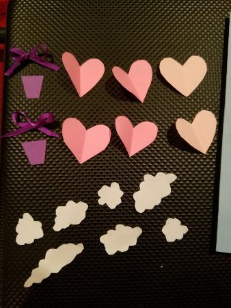Now you’re ready to glue on the baskets below the hearts and draw the strings! Then sprinkle the clouds around.