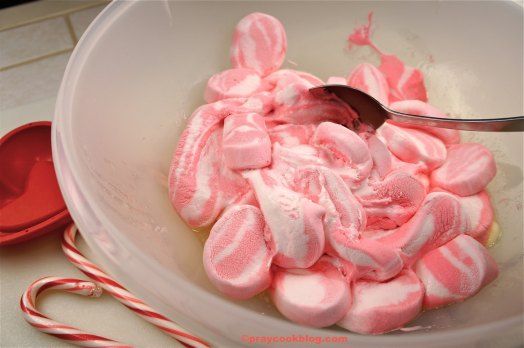 These peppermint marshmallows have been in the freezer since the middle of December. I let them thaw in the bag overnight and they are perfect. They are dry and fluffy and not all stuck together. I melted butter in the microwave in this bowl. Then I added the marshmallows for another 1 1/2 minutes. You can see that the marshmallows kept their shape but they are melted and ready to be stirred up.