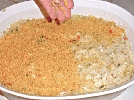Spray a 9" x 13" baking dish. Add casserole mixture. Top with corn flake crumbs.