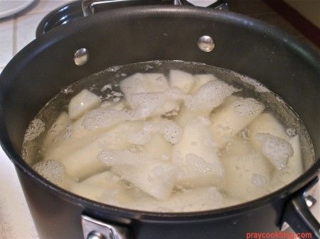 - Place potatoes in a large kettle; cover with water and cook for 20 to 25 minutes or until potatoes are tender. Drain and place in a bowl; Mash with potato masher.