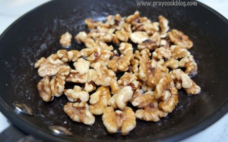 Over medium-high heat roast walnuts in 1 teaspoon of butter. When walnuts are nicely browned add 1 teaspoon of sugar, stirring well. Remove and cool.