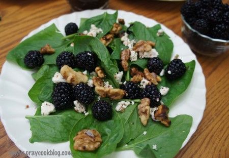 My Chief Culinary Consultant is also the gardener in our family. Oh, I piddle around with a few herbs and water and weed a little flower garden, but the FOOD comes from the hands of the Chief. Early in the morning, late in the evening and just about anytime in between he can be found patiently planting, weeding, watering and tending to our garden. It is never too hot or too cold for him to be in the garden. This year, early in the spring, he planted spinach, lettuce, collards, and kale. Every week he brings in a mess of each and we feast on the fresh produce. I found the recipe for this wilted spinach salad in the Summer 2012 edition of the Tennessee Home & Farm magazine. The picture caught my attention and I quickly realized my refrigerator held nearly all the ingredients for this luscious salad. I started with three plates of freshly picked spinach. Next came the walnuts. I really love roasted walnuts. I generally start with a teaspoon or so of butter and cook the walnuts over medium heat. If the heat is too high the walnuts will quickly burn. As the walnuts are becoming nicely browned, I stir in 1 teaspoon of sugar and stir to coat, then remove from heat and cool. While the walnuts are cooling, I mixed up the balsamic dressing. This dressing is so yummy and easy to make I can’t believe I even consider buying salad dressing at the grocery store — but I do. Mom recently purchased this cute little grinder/blender and it works perfect for mixing this dressing. Once the salad is ready, the well-mixed dressing goes into the microwave for about a minute. The incredible edible results …. As I was making this salad I was tempted to add some “stuff”. Carrots, onions, broccoli sticks … but in the end I decided to stick to this recipe and give it a try. I am so glad I did! The cheese is garlic and basil feta and with the fruity flavor from the blackberries, the nutty walnut texture and the warm balsamic it is a home run without any other ingredients! We ate this as a main dish at lunch but I can imagine it paired really well with fish or chicken for dinner. Thanks to the Chief I will have more spinach recipes coming our way! Many Blessings and Happy Cooking!